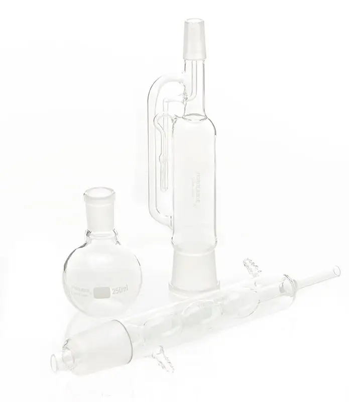 O extrator de soxhlet é composto por três partes, o balão fundo chato com gargalo curto e uma junta fêmea esmerilhada intercambiável. A corneta com uma junta macho e uma junta fêmea, ambas esmerilhadas e intercambiáveis com um sifão ao seu lado que determina sua capacidade. O condensador é tipo bola com uma junta macho esmerilhada intercambiável.